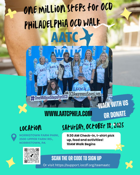 Another awesome OCD walk in the books! AATC was so excited to once again be participate in the ICODF One Million Steps for OCD Walk on Saturday October 18 at Norristown Farm Park. We had a great time and our team raised a lot of money for OCD research and awareness. AATC has been a proud participant, sponsor and top fundraiser for the Philadelphia One Million Steps for OCD walk since it started in 2013. In fact, we even hosted the walk at our center in its early years! The walk aims to raise funds, increase awareness about OCD and related disorders, and foster a strong community for those affected by these conditions. We hope you will come out for this fun and meaningful event. Join our team to walk or stop by our table and say hello! And if you can’t make it, please consider donating to our team to benefit the International OCD Foundation iocdf.org. Please click on the link for more information, to join our team or to donate. We’d love to have you join us! https://support.iocdf.org/team/768251